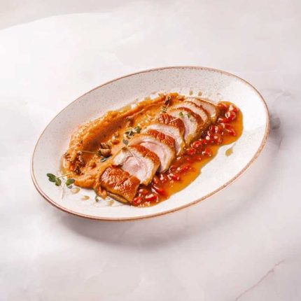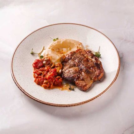 Свиная шея на хоспере с картофельным пюре и соусом с оливками