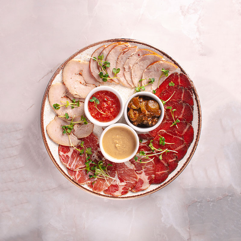 • телячья и свиная ветчина холодного копчения, буженина из индейки, утиный рулет, битые огурцы, соус горчица с хреном, микрозелень - 160/150 г.